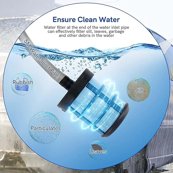 - DRAWS WATER FROM ANYWHERE - Comes with a 5M long garden hose, allow you to draw water from any fresh water source like a pool, lake, or bucket and . You can hook up to a garden hose at the house or even a 2L bottle on the go.
